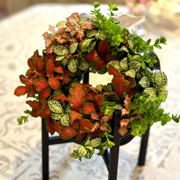 6月のレッスンは、観葉植物のリースです。いろんな色と形の小さな葉を、可愛いリースに宝石のように散りばめます。