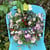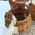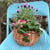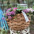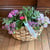 ガーデンストロベリーをバスケットに寄せ植えたポタジェ。濃いピンクの花が可愛い。もちろん実も収穫できます。こちらは背の低い苗でこんもり作りました。バスケットはナチュラルテイストの本格派。後で野菜入れにも使えそう。【売切れ】